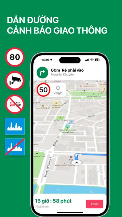 1. Phần mềm dẫn đường kết hợp cảnh thông tin giao thông: Biển báo tốc độ giới hạn, Biển báo vào khu dân cư, Biển báo ra khỏi khu dân cư, Biển báo tới đoạn đường cấm vượt, Camera giao thông, Camera theo dõi tốc độ