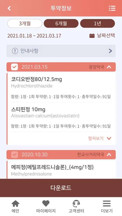 병원(약국)에서 조제 받은 최근 1년간의 의약품 투약 내역 조회