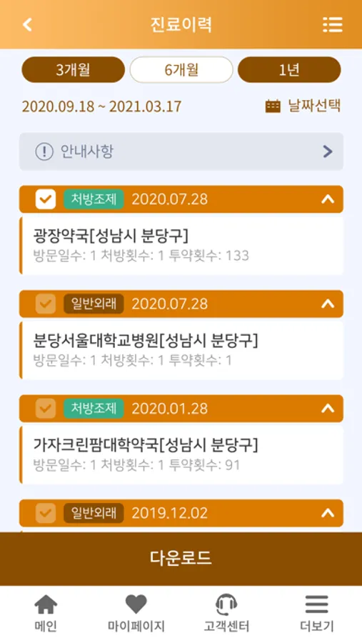 의료기관 및 약국을 방문한 최근 1년간의 진료 내역 조회