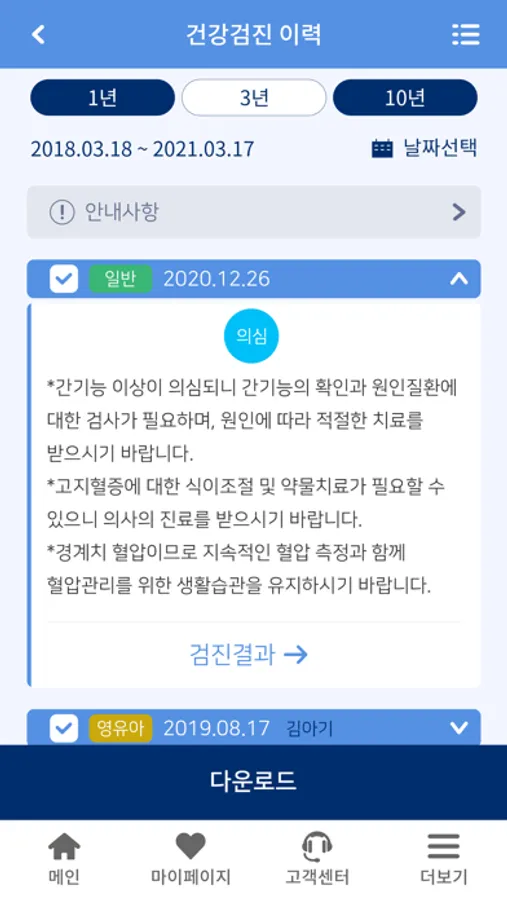 투약정보, 진료이력, 건강검진, 예방접종 내역과 같은 개인 건강기록을 파일로 다운로드하고 SNS, SMS 등으로 공유