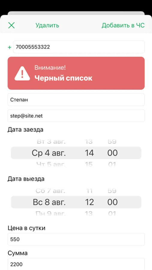 - Просматривать отзывы о клиентах (ЧС), вносить в базу ЧС