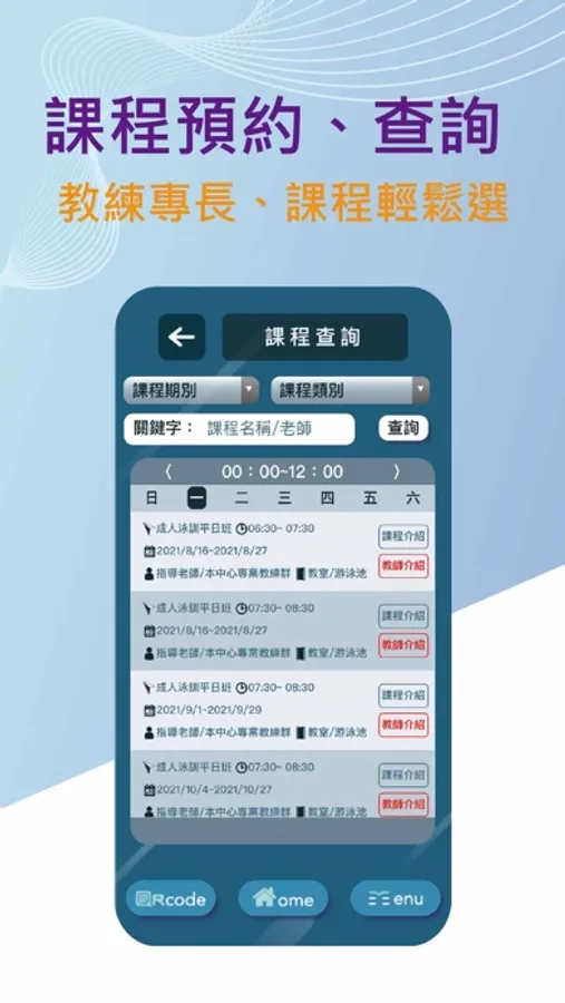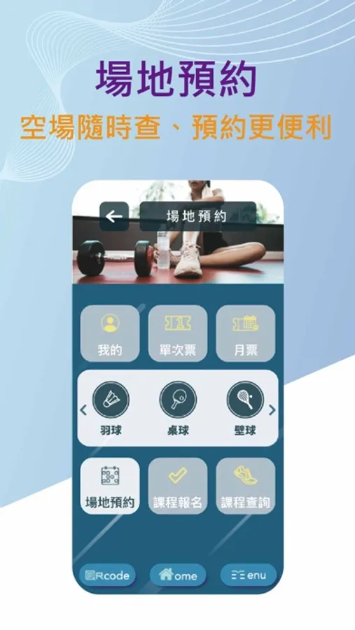 場地預約:依日期、時段,顯示可預約各類場地,並完成付費