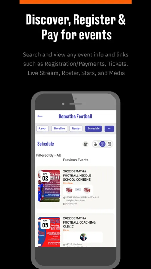 Search and view any event info and links such as Registration/Payments, Tickets, Live Stream, Roster, Stats, and Media