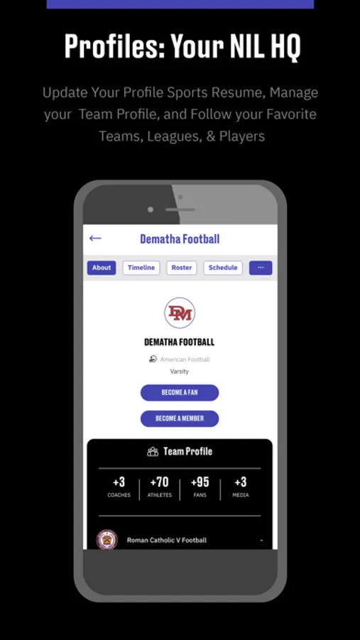 The best app to showcase and track your sports experience. This app is for school and travel sports teams, leagues, and organizations. The best online Profile for Athletes, Coaches, Parents, Fans, Sports Videographers/Photographers with integrated team management tools, search for people/teams, and events, game pages, and live stream integration.