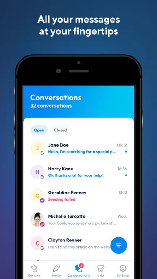 Chat with your customers on the most popular messaging platforms (Google, Messenger and Instagram)