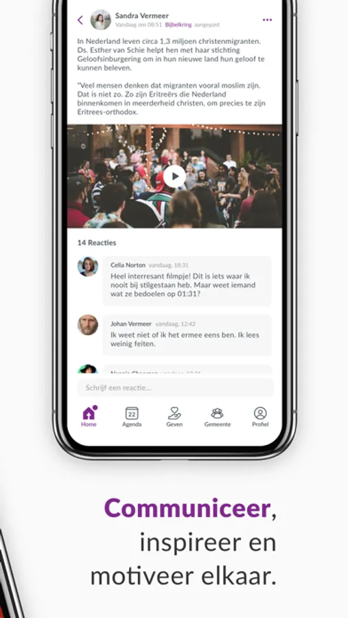 Dankzij onze unieke groepenstructuur helpen wij kerken beter te communiceren. Met de hele gemeenschap, maar ook onderling. U kunt zelf groepen toevoegen en mensen daarvoor uitnodigen. Een slimme timeline zorgt er voor dat iedere gebruiker persoonlijke en relevante informatie ziet.