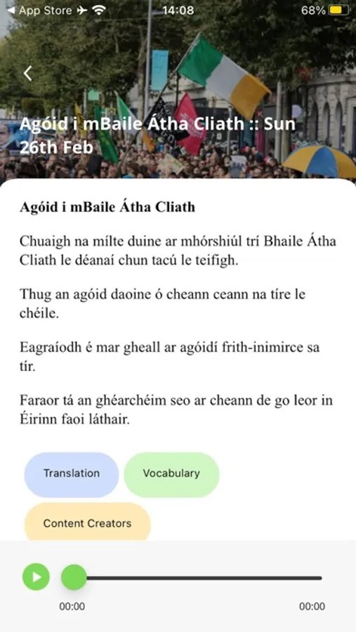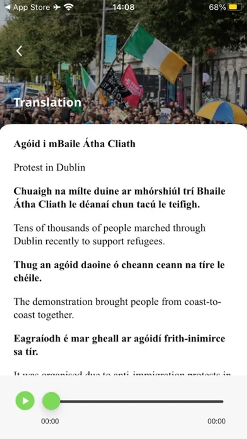 Our app is specifically designed to help you learn and practice Irish language skills through engaging content that features current events. With a combination of Irish text and Irish audio, you'll be able to immerse yourself in the language and improve your fluency in no time.