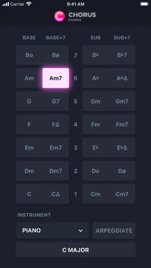 Our simple chord system gives you access to the most popular chords used in modern music, and lets you play them with eight different instruments, all just with a single tap.