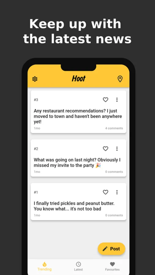 Feeling chatty? Why not Hoot about it? With Hoot, you can anonymously share your thoughts and ideas with those around you. Create a post and wait for the comments to fly in!