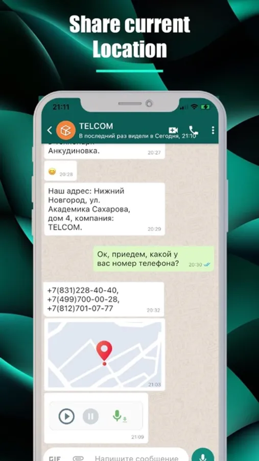 Отправьте своё местоположение в индивидуальный или групповой чат. Остановите его показ в любое время. Или же запишите голосовое сообщение, чтобы быстро передать информацию.
