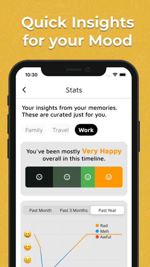 The app provides progress and insights that help users to analyze patterns in their moods and memories. The app uses these patterns to give personalized statistics and helpful insights that can help users to pinpoint problems with their mood patterns, solve issues, and have a good mood more often. It can also be used as a mood tracker.