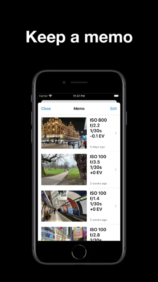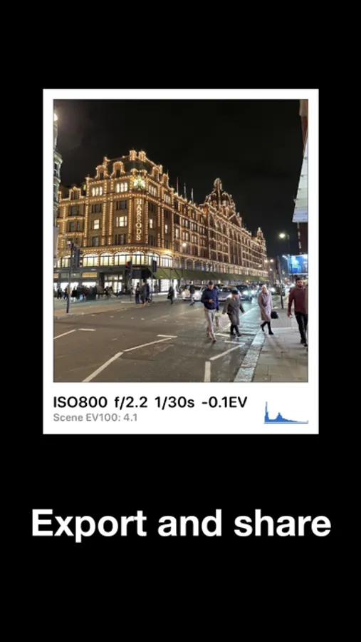 Keep a memo of the settings used, including a photo of the scene and the location. Export it as a beautiful picture note formatted in 4:5 aspect ratio, great for posting to Instagram along with your photo.