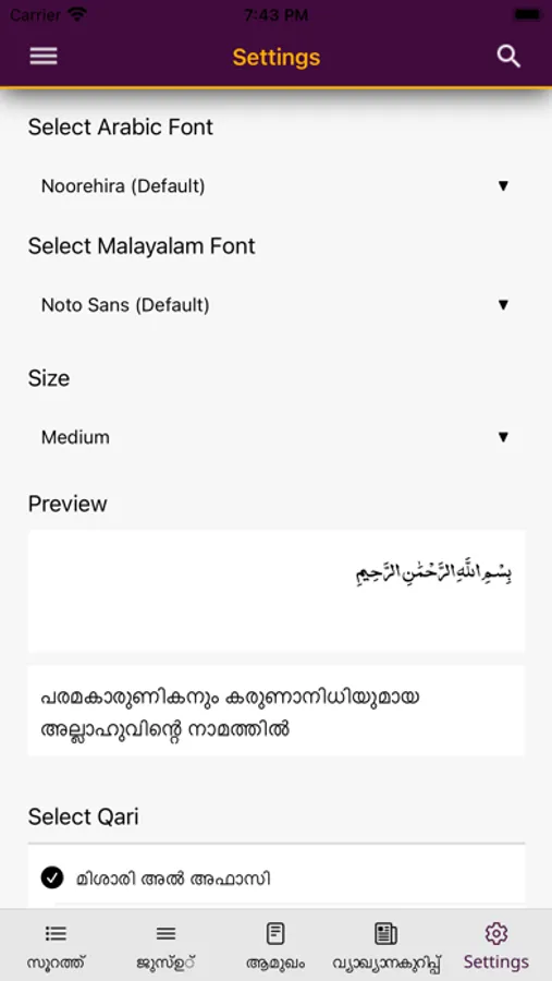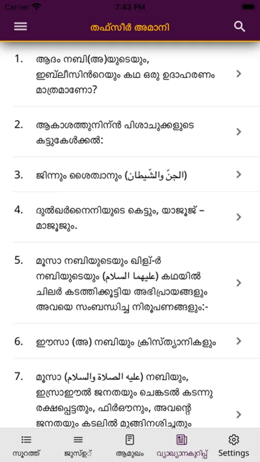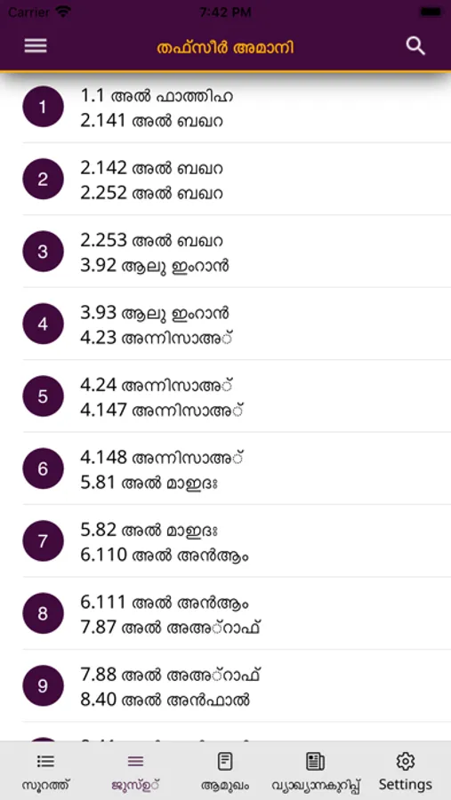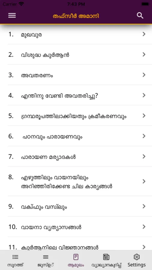 This is a comprehensive and consummative study of Qur'an Thafseer prepared in Malayalam. This solemnised venture comes from Sheikh Mohammed Amani Moulavi. It is an authentic perception of Qur'an studies, Hadees and Islamic History elaborated in the lights of Ayah. To append to its clarity there are interpretations from the author himself.