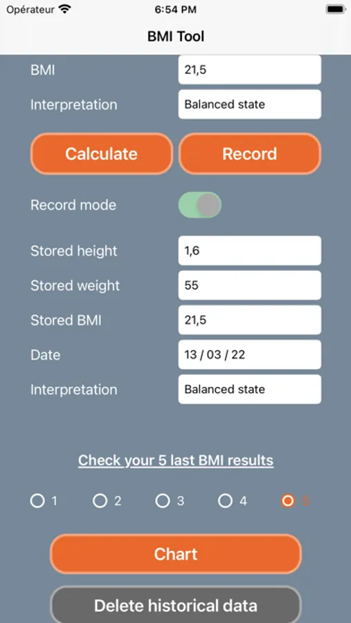 ENG: Tool allowing to calculate your body mass index ("BMI") and monitor its evolution over time thanks to its recording functionality (historical results can be retrieved offline) and visualization functionality. The tool also provides an instantaneous interpretation of the BMI result obtained.