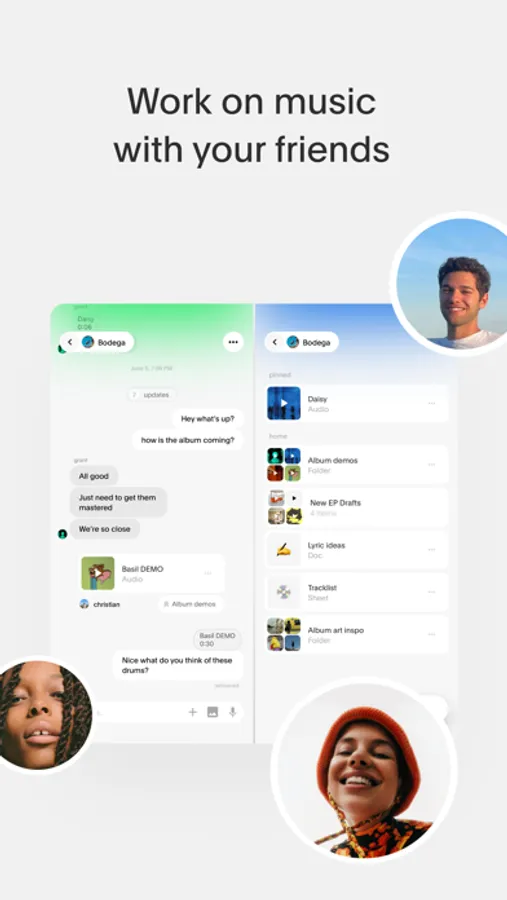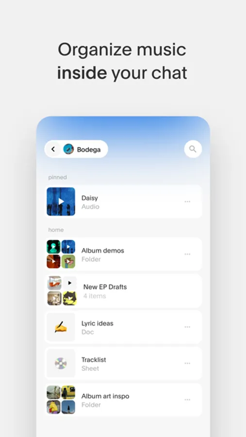 Seamlessly navigate between your files and your chat: see all of your music files in one place, with updates automatically reflected in your chat in real time. No more lost demos or expired links, and no one gets left behind.