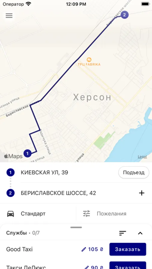 Указав маршрут поездки, приложение расчитает стоимость сразу в нескольких службах города Херсон.