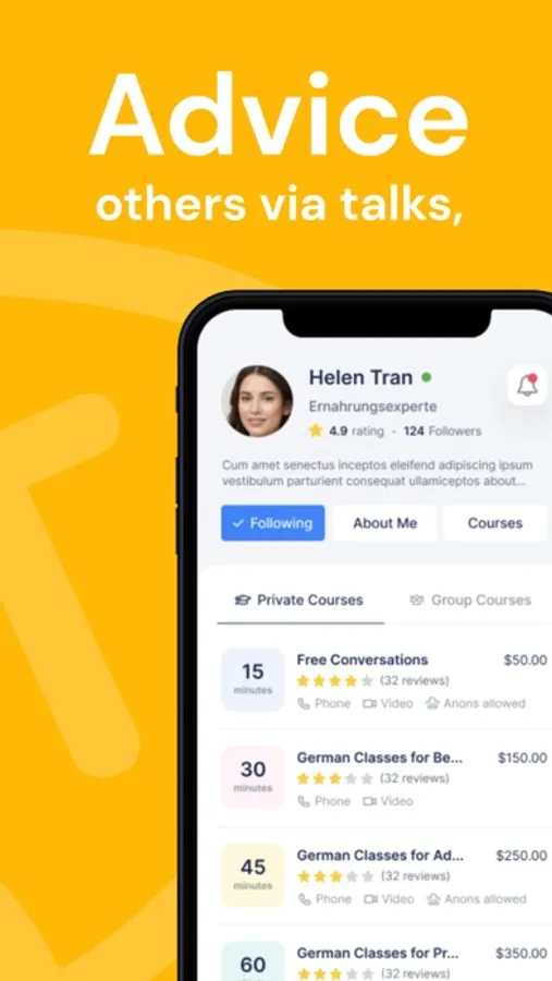 Du kannst beliebig viele Talks erstellen. Dabei legst du das Thema, die Dauer und den Preis fest.