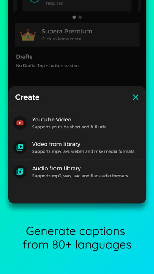 - Generate captions/subtitles for Youtube Videos by pasting the link or just sharing the link from Youtube App