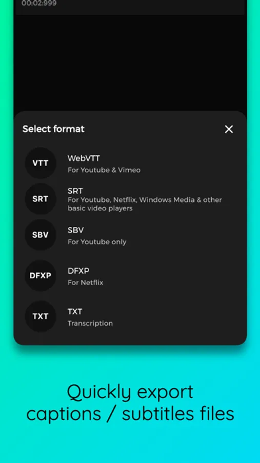 - Quick export to various formats like SRT, VTT, SUB, DFXP & TXT