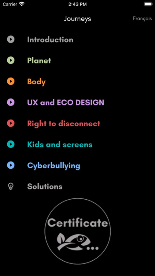 This application is a tool for sustainable co-development. It is made up of chapters that explore topics related to responsible digital technology. Each chapter starts with a mini podcast from a recognised expert in the topic, continues by allowing you to calculate your own digital impact, and concludes with a few interactive activities.