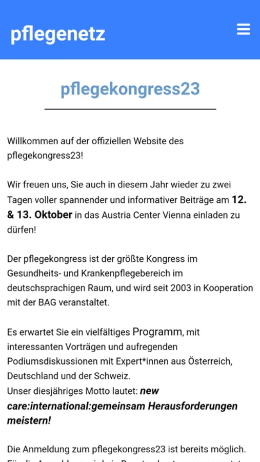 Die App zum pflegekongress23 (12. & 13. Oktober 2023 im ACV) unter dem Motto „new care:international:gemeinsam Herausforderungen meistern!“ zur unkomplizierten Information zu Tagungsprogramm, den Räumlichkeiten und den Pausenzeiten.