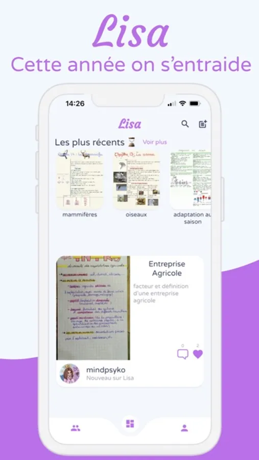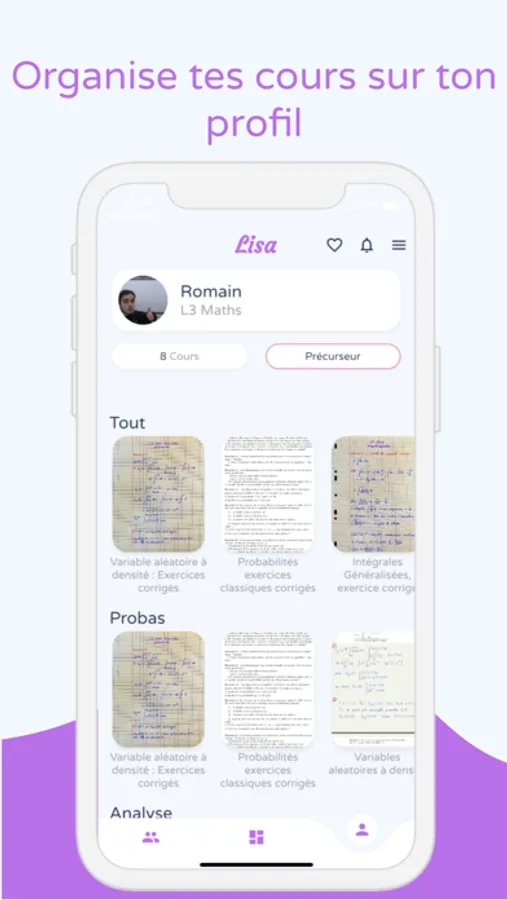 Construit sur un modèle de réseau social, Lisa te permet de chercher les cours dont tu as besoin. Utilise l'outil de recherche pour trouver un cours précis ou explore la plage d'accueil en fonction de ton niveau d'étude ou de tes matières préférées pour trouver ce qu'il te faut.