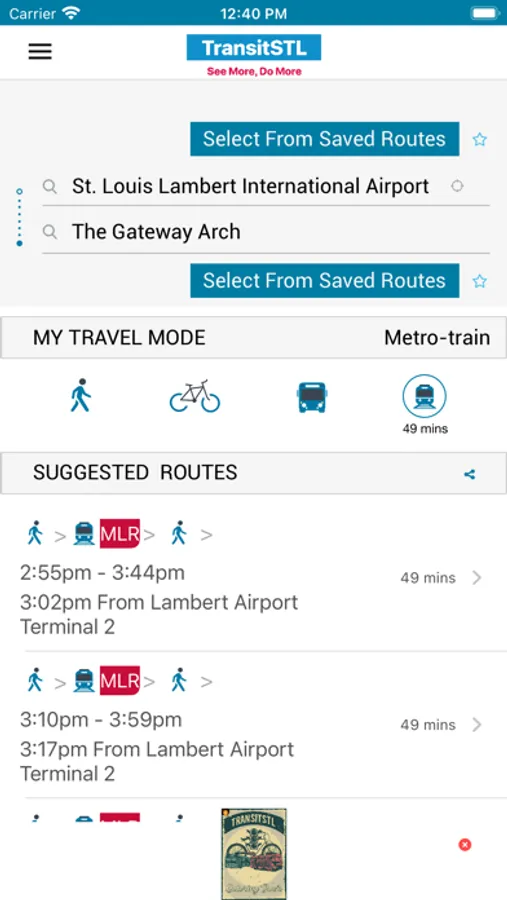 TransitSTL App features a host of functions that enhances the transit experience in the St. Louis region. Transit users, bikers, and pedestrians will all be able to log their transit trips to earn points that can later be redeemed for prizes through the "See More, Do More" Riders Rewards program. Other in app features include: transit routing and mapping, transit savings calculator, carbon emissions savings calculator, a pedometer and access to program information, news, and updates from TransitSTL. Download this free app to start earning rewards for riding transit today!