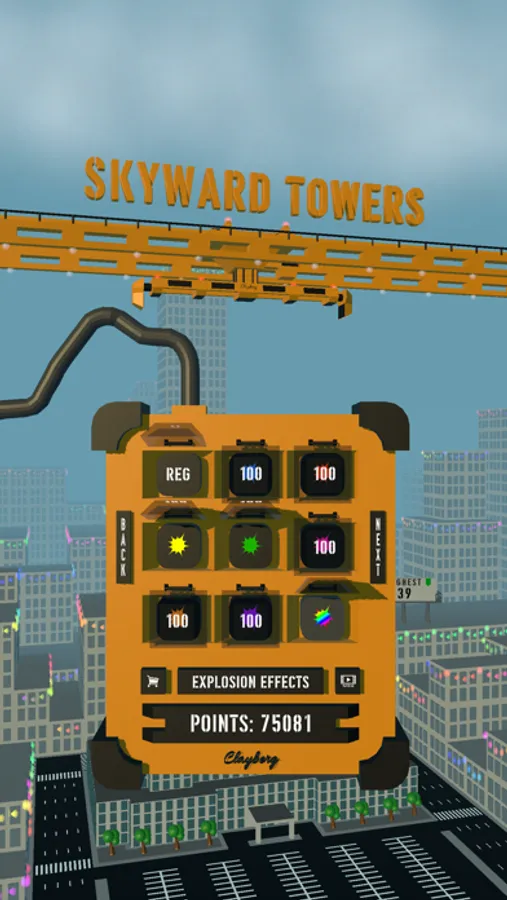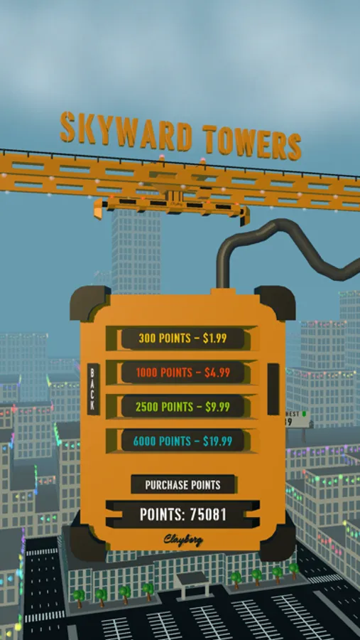 Skyward Towers also has an in-game store where tools/utilities and aesthetics can be purchased using points. A player can earn points for every segment successfully landed and the accuracy of the landed segment. Points can also be obtained by watching short ads or through in-app purchases.