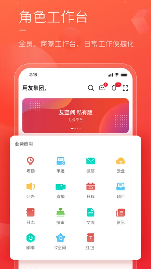 友空间私有版是用友旗下的一款免费的移动办公软件,私有版是面向大中型企业和组织的“融合、开放、连接”的协同平台,帮助企业实现高效办公协同工作,实现企业与企业、企业与人的协同、交易等社会化商业活动。