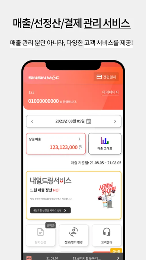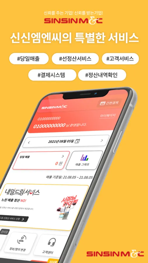 신뢰주는 기업 신뢰받는기업 (주)신신엠앤씨에서 가맹점 사장님들의 편의를 위해 제작한 어플입니다.