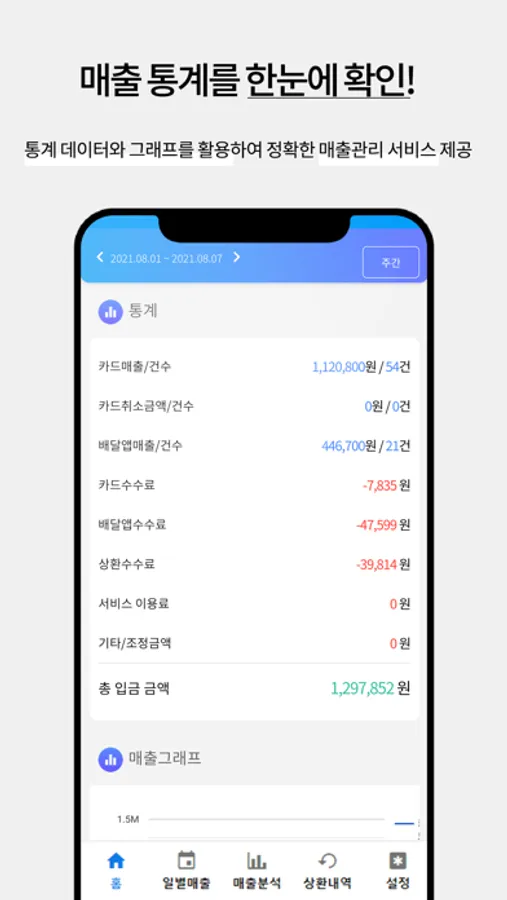 - 일별, 월별 결제 및 입금내역, 입금예정금액 확인과 매출액에 따른 그래프 제공