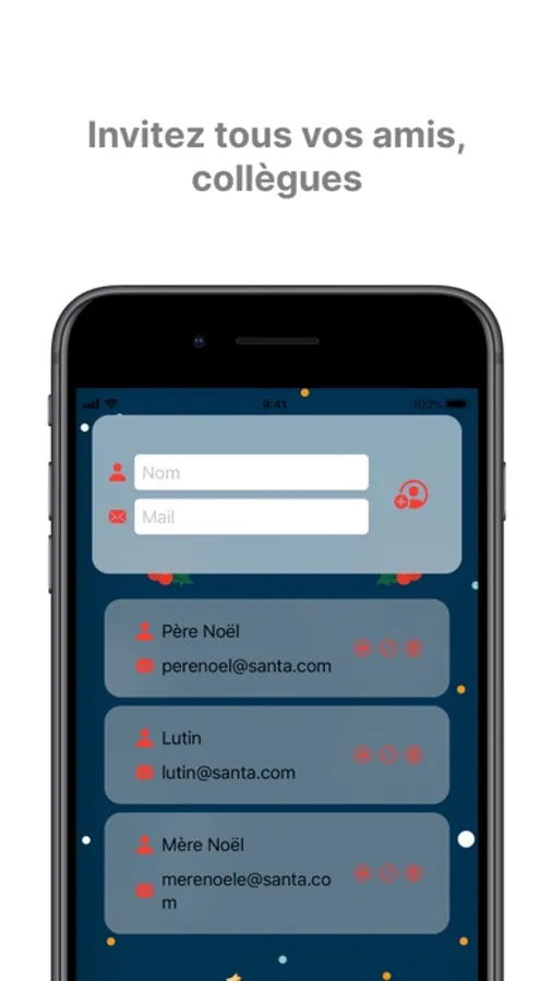 No personal data is stored in the application, nor shared. Participants receive an email with the rules, the assigned person and that's it.
