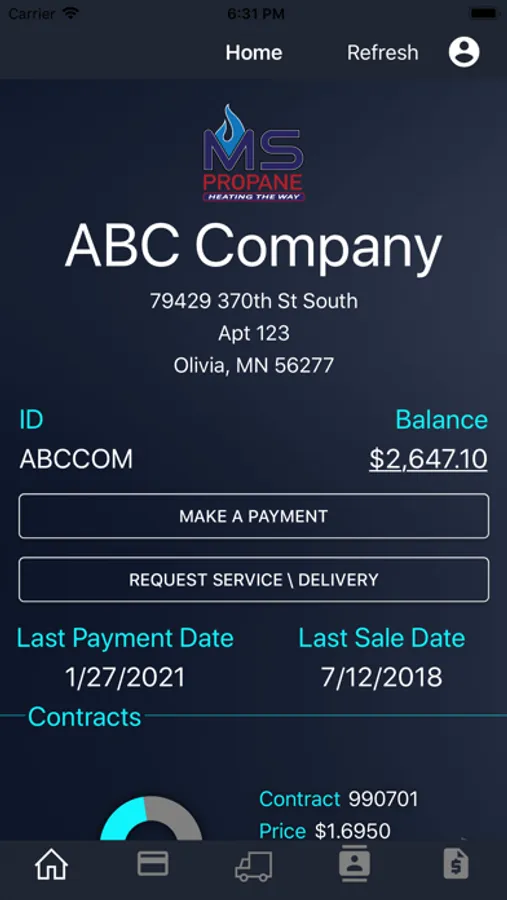 Information at your fingertips! This app gives you direct access to your account balance, location and contract information. It also gives you the ability to store and process payment and request service work and deliveries directly through the app.