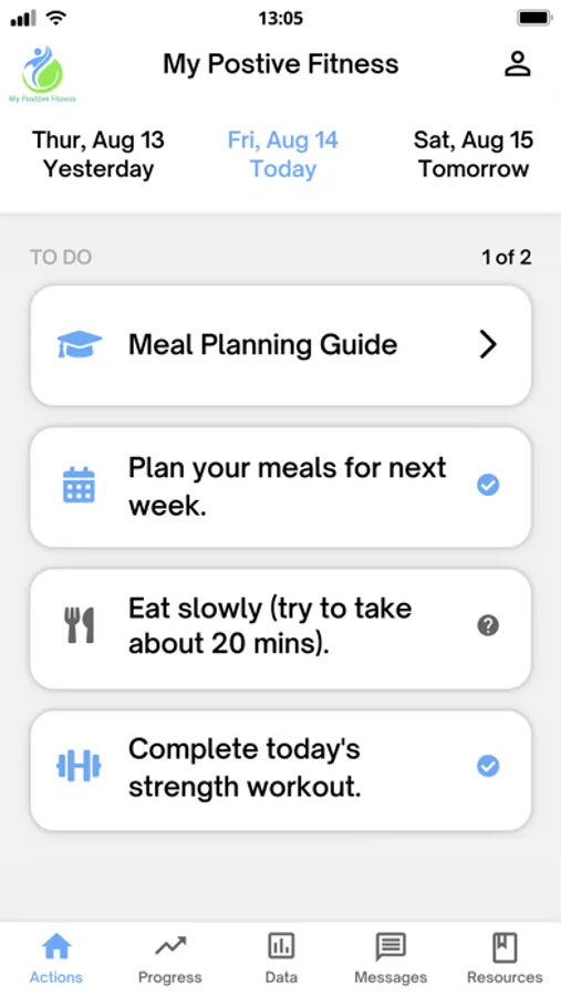The My Positive Fitness app is designed for clients of trainers who have enrolled in the My Positive Fitness program. The app will send push notifications and prompt clients to answer yes/no question in regards to comply with healthy habits sent by your coach.