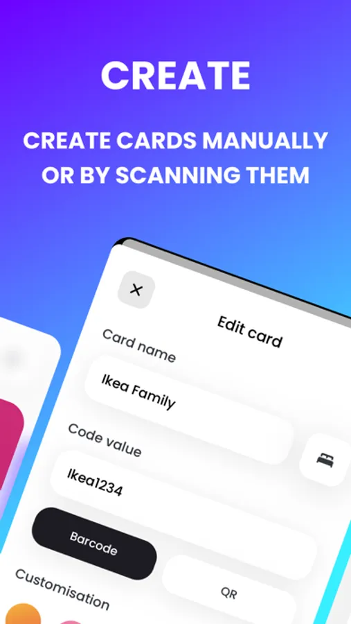 • Create cards effortlessly: Scan barcodes on loyalty cards, tickets or any other cards with a bar or QR code on it in a matter of seconds.