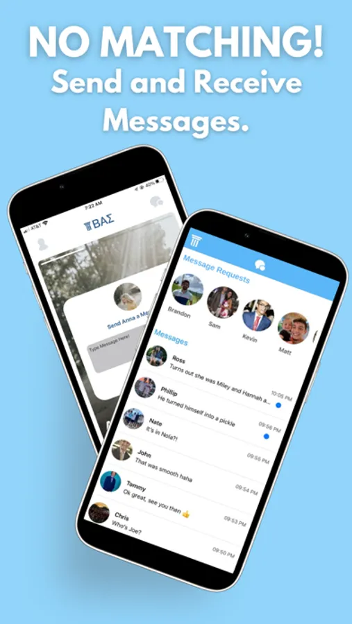 BAΣ is an app designed to connect you specifically with students from your university. Whether you need a Date to a Greek Life Event, want to meet more people, or find your new special someone. No more relying on other people to introduce you, you can meet and find someone at your university right on the BAΣ app.