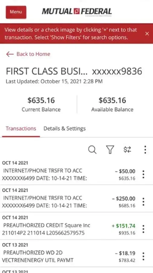 With the Mutual Federal mobile app, it's easier than ever to bank on the go, anytime, anyplace. Our app provides a convenient unified user experience, meaning one app for your personal and business accounts. View account balances and history, transfer funds, deposit checks, pay bills and people, find our locations and ATMs, and contact a member of our team with the savviest mobile technology right at your fingertips! Get started on using our app today! We've made this better by offering it FREE of charge.*