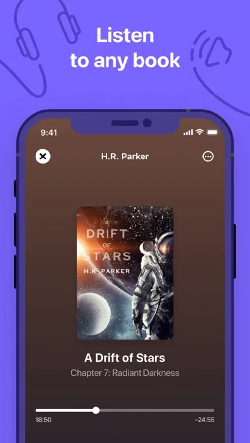 Audiobooks at the top of your home page. Customize your reading experience with light or dark displays, text size, background color, and instant access to all chapters in a handy pop-up menu.