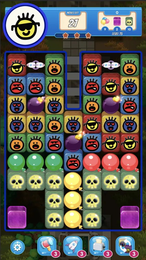 - Larger combinations of the same Emoji Blocks will gift you with awesome boosters such as the "Double Rocket", "Emoji Bomb", "Smiley Wheel" and more!