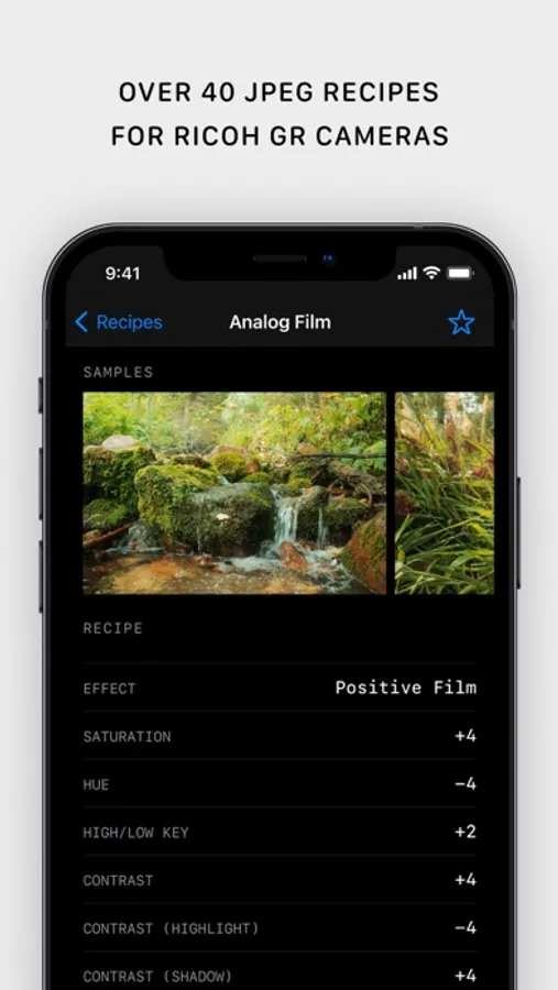 Ricoh Recipes is a free app that gives you access to over 40 JPEG Recipes for Ricoh GR cameras! These JPEG settings allow you to get various looks straight out of camera, many inspired by film stocks and analog aesthetics. No need to edit! If you have a Ricoh GR, GR II, GR III, or GR IIIx camera, there are JPEG Recipes in this app that are compatible with your gear—it's a great resource for Ricoh GR photographers! Simply select the recipe you want, adjust the JPEG settings as required, and shoot!
