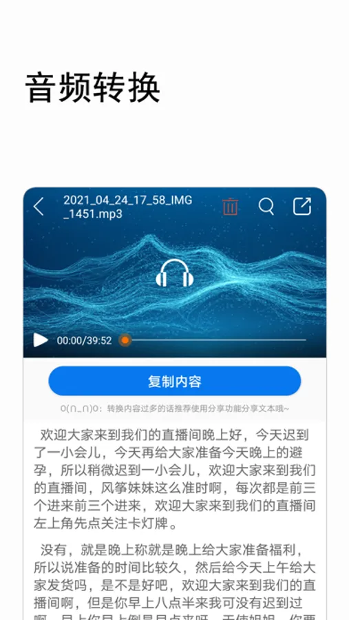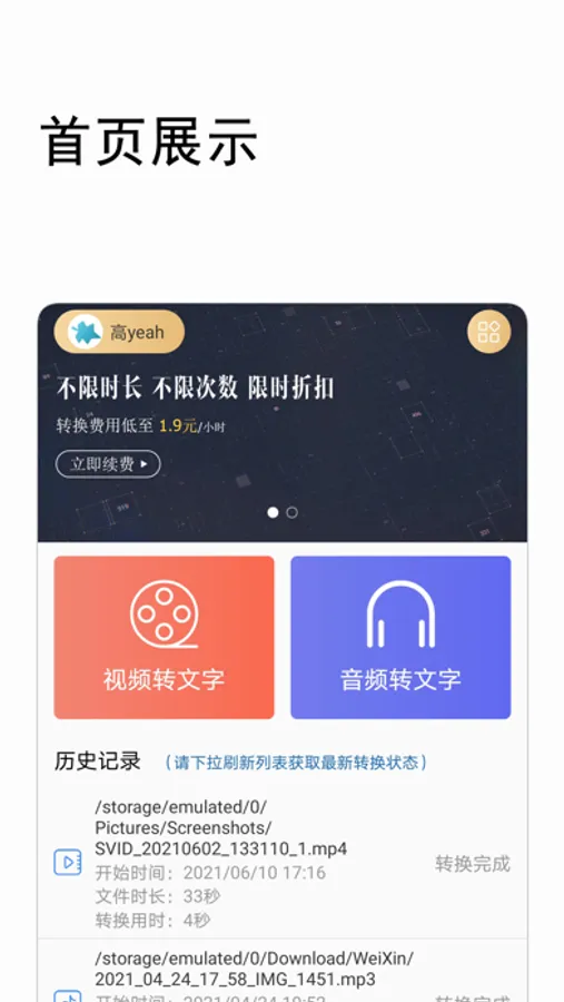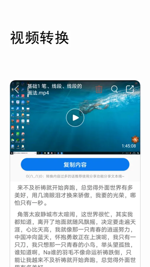 音视频转文字是一款可以将视频、音频、录音转为文字的APP,能够进行大文件识别、云端处理音频、视频、录音文件,无需在APP界面等待。准确迅速,操作简单,可以实现汉语、英语转换,满足日常生活工作中视频转文字、音频转文字、录音转文字,可以学习视频课程时使用,强化学习记忆,也可以转换语音备忘录、语音通话、视频会议记录。