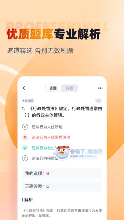 行政执法资格题库内含考点练习,全国通用卷以及地区卷模拟练习,以及按照固定考试比重的随机式的抽题的真题考场,成绩单实时记录考试数据,一点一滴的反馈考生近期学习状态以及自我正确率的提升,大大的给予考生通过考试的信心。