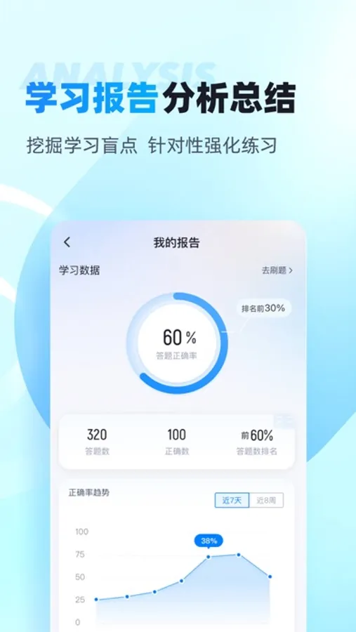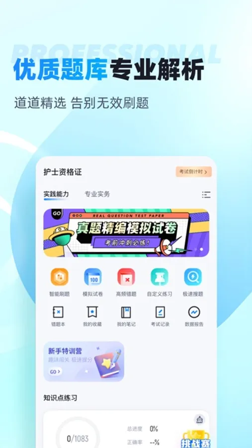 护士资格证题库内含考点练习,全国通用卷以及地区卷模拟练习,以及按照固定考试比重的随机式的抽题的真题考场,成绩单实时记录考试数据,一点一滴的反馈考生近期学习状态以及自我正确率的提升,大大的给予考生通过考试的信心。