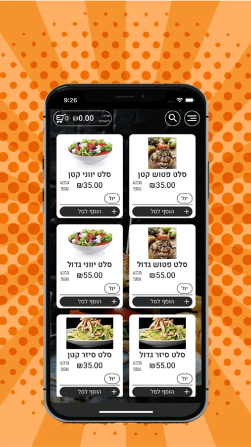 ניתן לבחור מגוון גדול של תוספות להמבוגר ולסלטים
