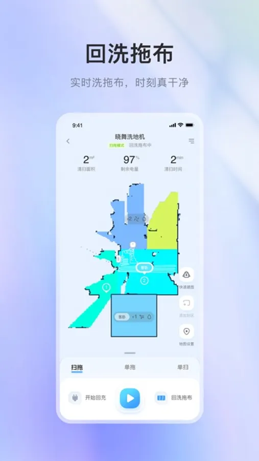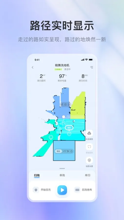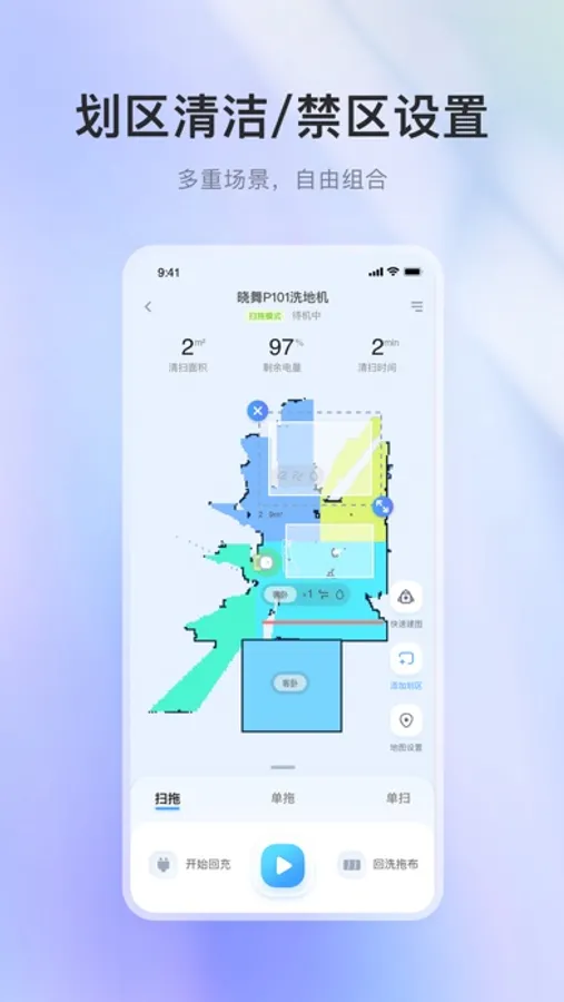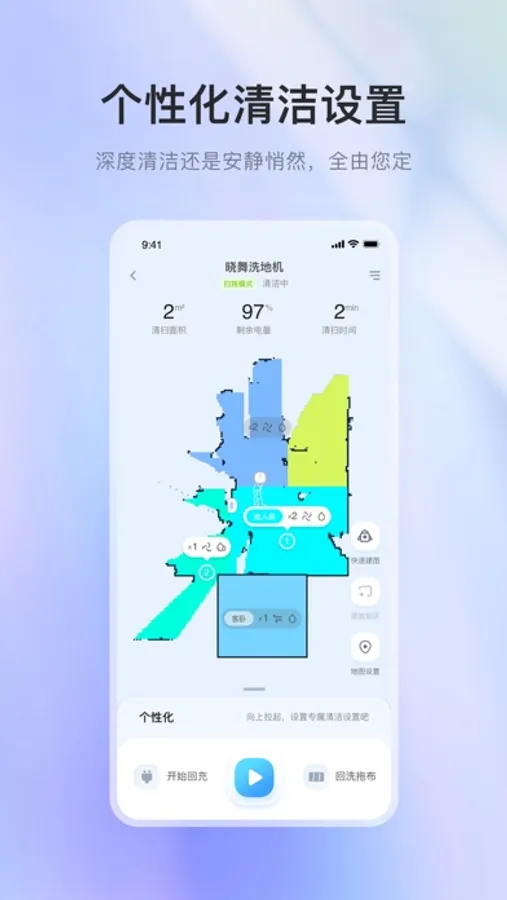 and meet your personalized cleaning requirements in different scenarios. Under [Three cleaning modes], you can adjust the cleaning frequence, suction power, and mop humidity, and set different combinations to meet your cleaning requirements. Through [Mop cleaning],