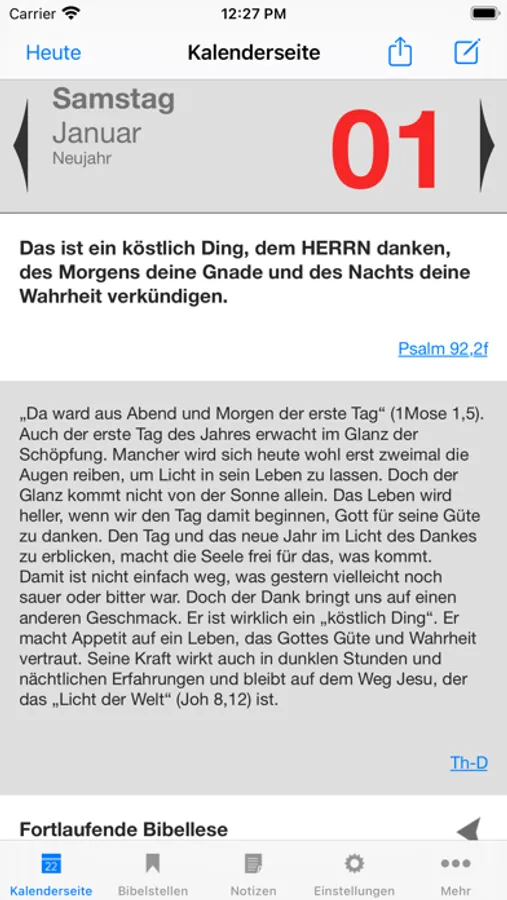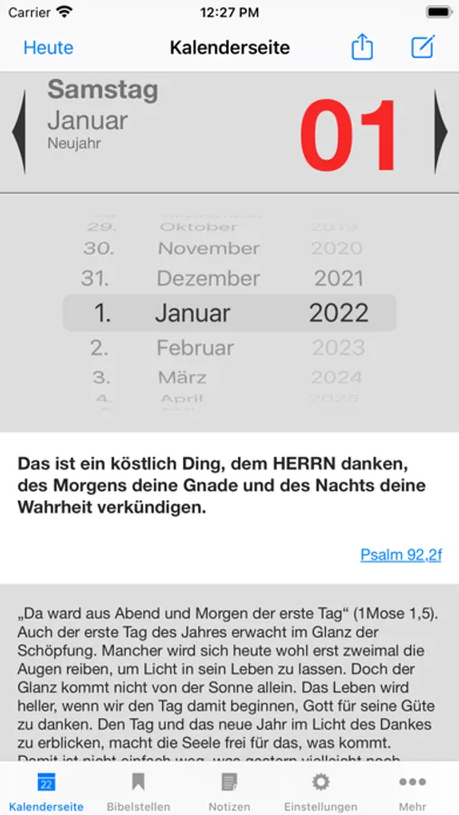 - Heute-Ansicht mit Datum, Wochentag, Bibelvers, Auslegung