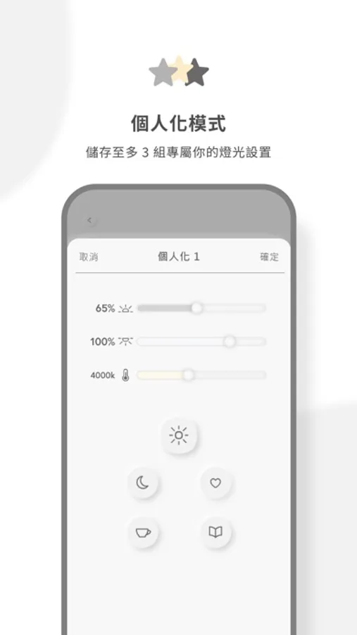 • Set up 3 customization modes to suit you, by choosing your own brightness and color temperature level