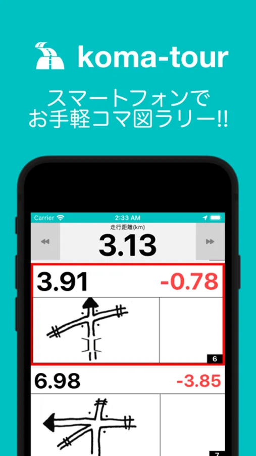 距離計とコマ図表示をこのアプリが一体化、このアプリのみでコマ図ツーリング・ラリーを楽しむ事ができます。