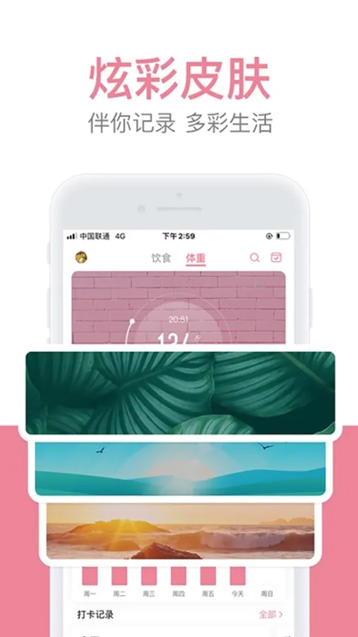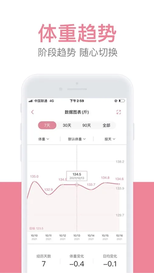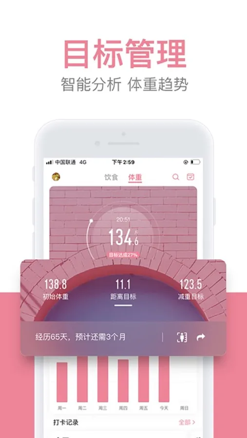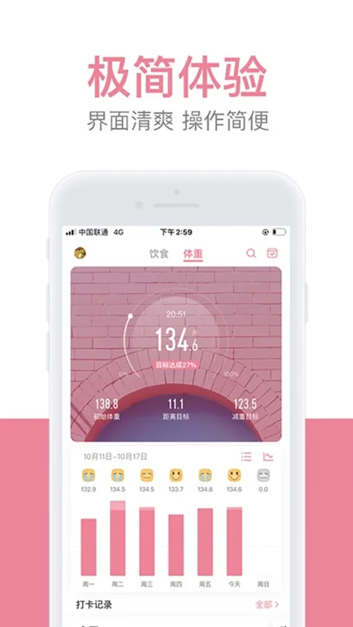 2、体重列表、柱形图、趋势线、百分比圆环等多种方式为您展示减肥进展