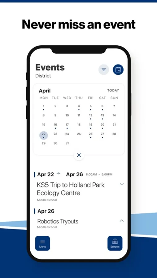 The event section shows a list of events throughout the district. Users can add an event to your calendar to share the event with friends and family with one tap.